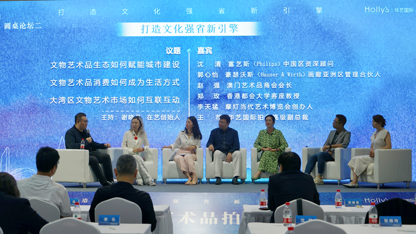 第二部分的主題為“打造文化強(qiáng)省新引擎”。在北京在藝科技創(chuàng)始人謝曉冬的主持下,富藝斯中國區(qū)資深顧問沈清、豪瑟沃斯(Hauser & Wirth)畫廊亞洲區(qū)管理合伙人郭心怡、澳門藝術(shù)品商會(huì)會(huì)長趙強(qiáng)、香港都會(huì)大學(xué)客座教授鄭玫、摩燈當(dāng)代藝術(shù)博覽會(huì)創(chuàng)辦人李天猛、華藝國際拍賣高級(jí)副總裁王薦等嘉賓圍繞“打造文化強(qiáng)省新引擎”主題,就文物藝術(shù)品生態(tài)如何賦能城市建設(shè),文物藝術(shù)品消費(fèi)如何成為生活方式,大灣區(qū)文物藝術(shù)市場如何互聯(lián)互動(dòng)等議題進(jìn)行討論。與會(huì)嘉賓認(rèn)為,藝術(shù)產(chǎn)業(yè)是未來社會(huì)和經(jīng)濟(jì)發(fā)展的重要領(lǐng)域,是滿足和豐富民眾精神需求的重要內(nèi)容,而大灣區(qū)具有天然的區(qū)位優(yōu)勢,連接國內(nèi)和國際兩個(gè)市場,匯聚傳統(tǒng)和潮流兩股資源,要不斷交流互動(dòng),不斷創(chuàng)新模式,形成國際優(yōu)勢。