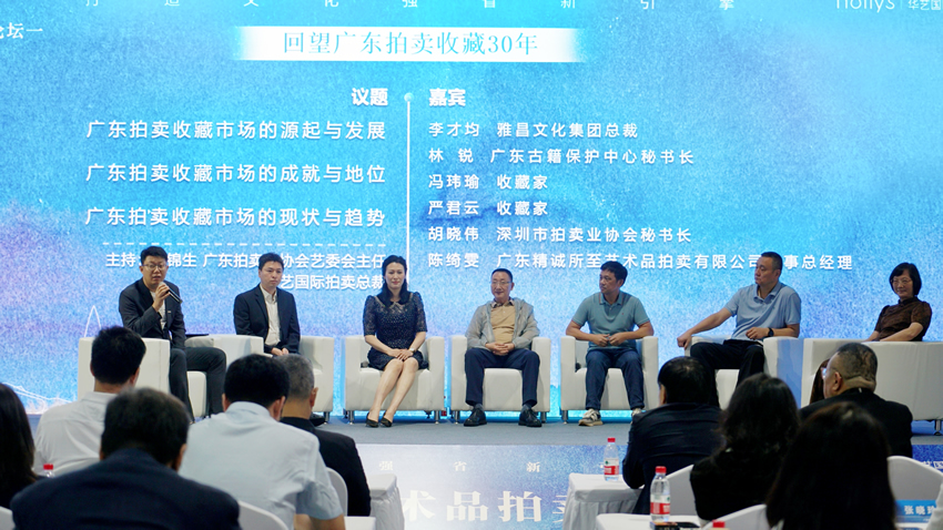 第一部分的主題為“回望廣東拍賣收藏三十年”。在廣東拍賣業(yè)協(xié)會(huì)藝委會(huì)主任余錦生的主持下,雅昌文化集團(tuán)總裁李才均、廣東古籍保護(hù)中心秘書長林銳、收藏家馮瑋瑜、收藏家嚴(yán)君云、深圳市拍賣業(yè)協(xié)會(huì)秘書長胡曉偉、廣東精誠所至藝術(shù)品拍賣有限公司董事長陳綺雯等嘉賓圍繞主題,共同回顧廣東文物藝術(shù)品拍賣收藏市場的源起與發(fā)展,總結(jié)成就與地位,分析現(xiàn)狀與趨勢。與會(huì)嘉賓一致認(rèn)為,廣東文物藝術(shù)品市場具有很強(qiáng)的歷史根基、文化特色、地域優(yōu)勢,三十年來穩(wěn)步發(fā)展,已經(jīng)形成完善的收藏、研究、交易、展示和服務(wù)業(yè)態(tài)體系,在國內(nèi)和國際市場中扮演重要角色。
