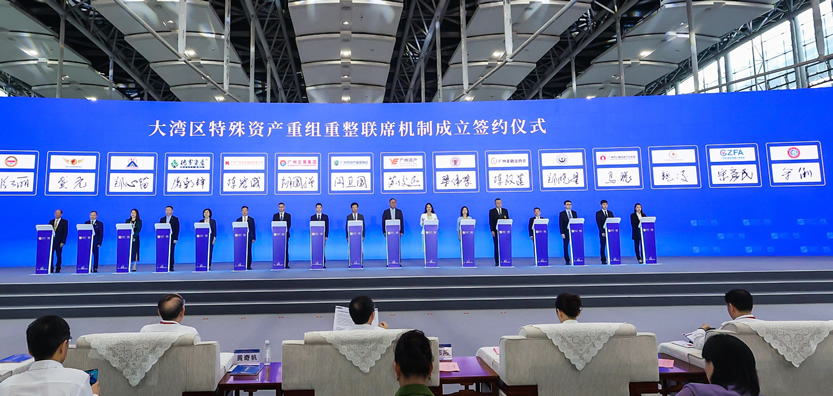 論壇期間進(jìn)行了大灣區(qū)特殊資產(chǎn)賦能服務(wù)平臺(tái)揭牌儀式及4項(xiàng)重要簽約儀式。其中,協(xié)會(huì)作為共建單位,參與大灣區(qū)特殊資產(chǎn)重組重整聯(lián)席機(jī)制,該機(jī)制是市政府今年推動(dòng)成立的四大特殊資產(chǎn)管理平臺(tái)之一。該平臺(tái)整合金融、法律和產(chǎn)業(yè)資源,致力于服務(wù)于灣區(qū)、華南、乃至全國特資市場。旨在促進(jìn)粵港澳大灣區(qū)特殊資產(chǎn)有效重組重整,優(yōu)化資源配置,助力實(shí)體經(jīng)濟(jì)高質(zhì)量發(fā)展。鄭曉星會(huì)長代表協(xié)會(huì)與廣州市資產(chǎn)管理協(xié)會(huì)等17家單位共同簽約。