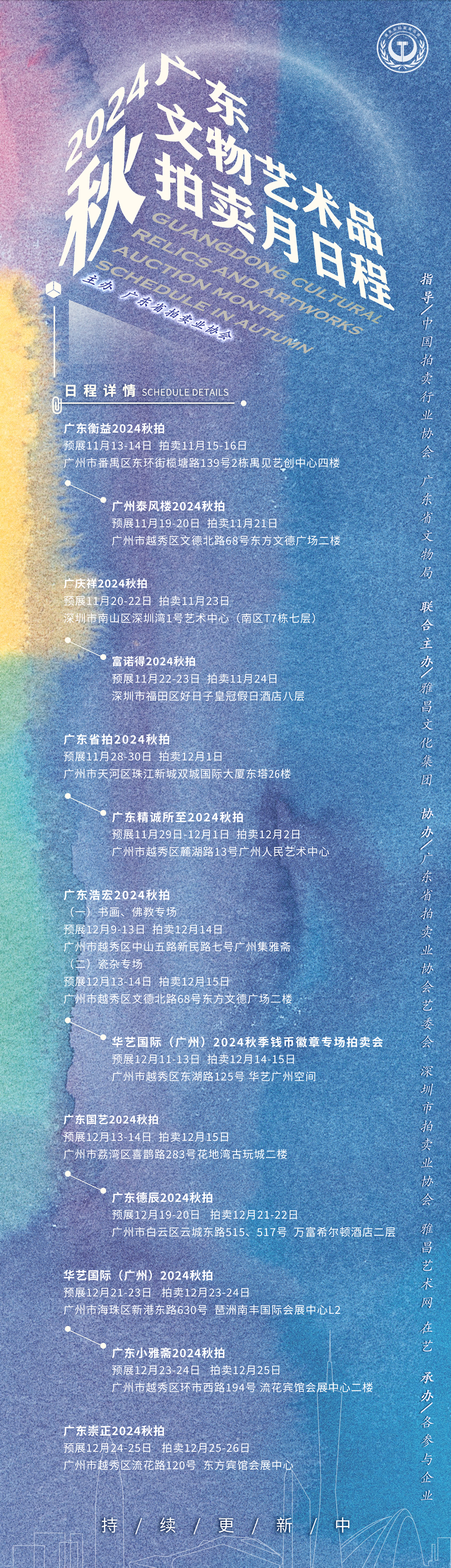 繼2024春首屆廣東文物藝術(shù)品拍賣月成功舉辦后,2024秋廣東文物藝術(shù)品拍賣月即將啟幕。拍賣月活動(dòng)由政府有關(guān)部門及中國拍賣行業(yè)協(xié)會(huì)指導(dǎo),廣東省拍賣業(yè)協(xié)會(huì)主辦,廣東省拍賣業(yè)協(xié)會(huì)藝委會(huì)和相關(guān)參與企業(yè)承辦。