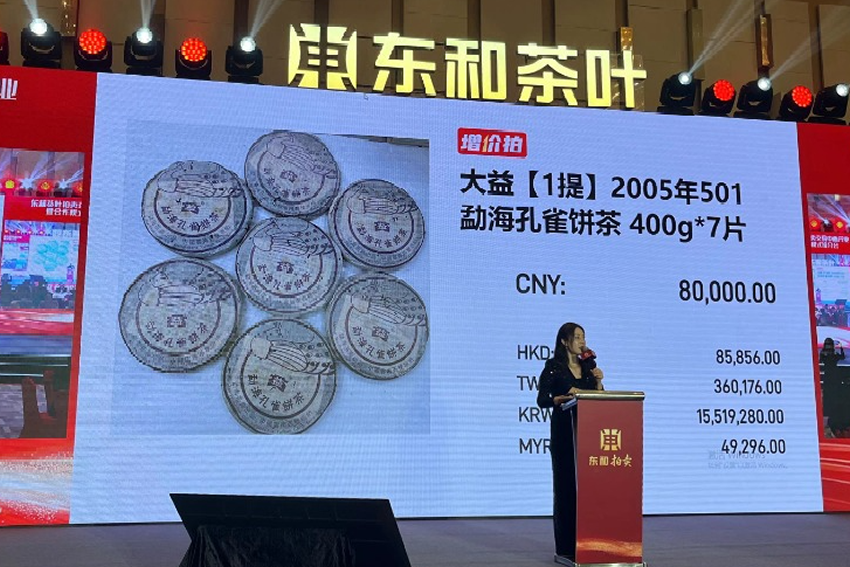 晚宴現(xiàn)場(chǎng)還舉行了東和茶葉稀缺高貨的競(jìng)拍活動(dòng),此次活動(dòng)匯聚了50年代藍(lán)鐵、2003年班章四星孔雀、302批次興海景邁茶、501批次勐??兹覆栾?、601批次班章有機(jī)生茶等諸多稀缺明星老茶,活動(dòng)拍品均順利拍出,單個(gè)拍品的成交高達(dá)60萬(wàn)元,優(yōu)質(zhì)年份茶的市場(chǎng)價(jià)值得到高度認(rèn)可,展示了年份茶的蓬勃發(fā)展態(tài)勢(shì)。