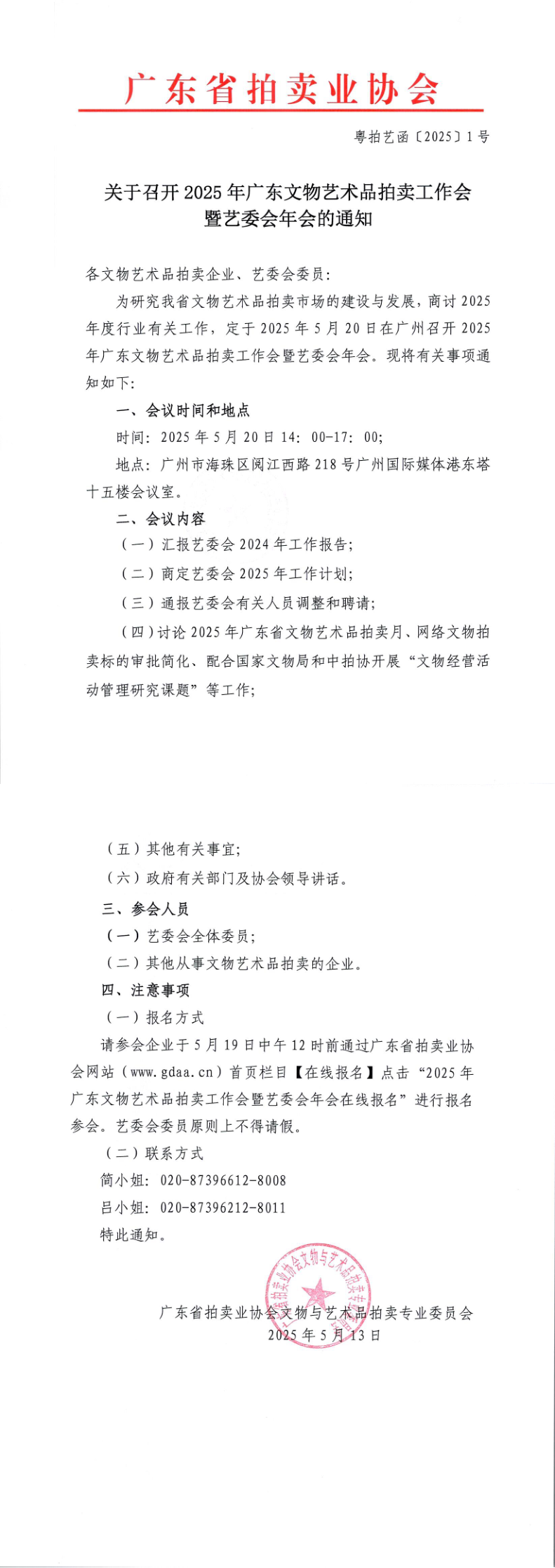 關(guān)于召開(kāi)2025年廣東文物藝術(shù)品拍賣工作會(huì)暨藝委會(huì)年會(huì)的通知