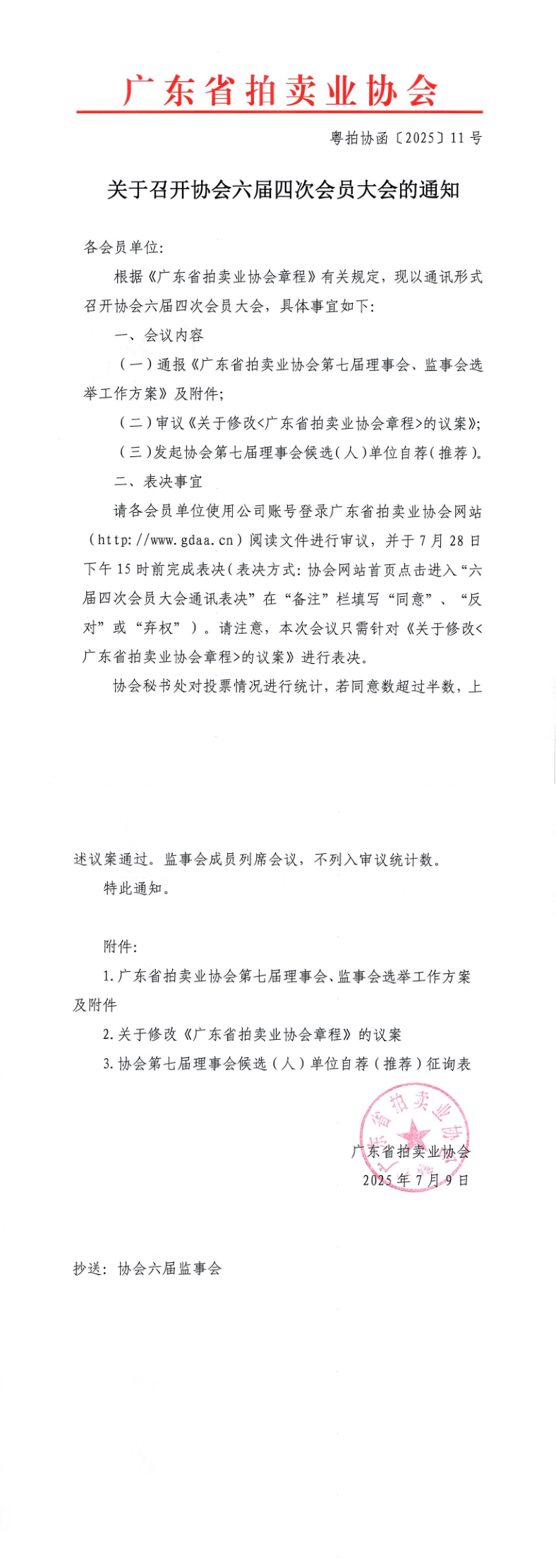 1.廣東省拍賣業(yè)協(xié)會第七屆理事會、監(jiān)事會選舉工作方案及附件(點擊下載) 2.關于修改《廣東省拍賣業(yè)協(xié)會章程》的議案(點擊下載) 3.協(xié)會第七屆理事會候選(人)單位自薦(推薦)征詢表(點擊下載)